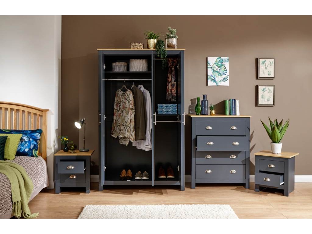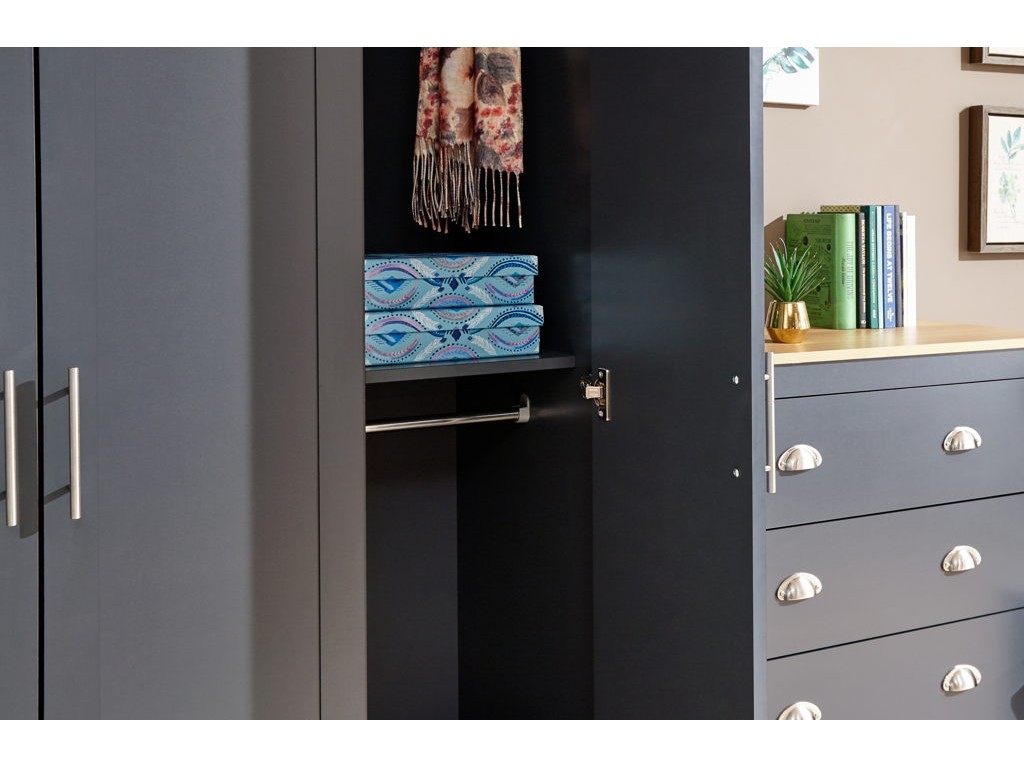 It's easy to create a bedroom that showcases effortless chic, with this stylish four-piece furnishing pack. The shaker-inspired design exudes understated luxury. Comprising a three-door wardrobe, four-drawer chest and pair of neat lamp tables, each piece is finished in cream, grey or blue foil with an oak top and brushed steel handles. A well-thought-out mix of hanging and flat storage that's suitable for a double room.