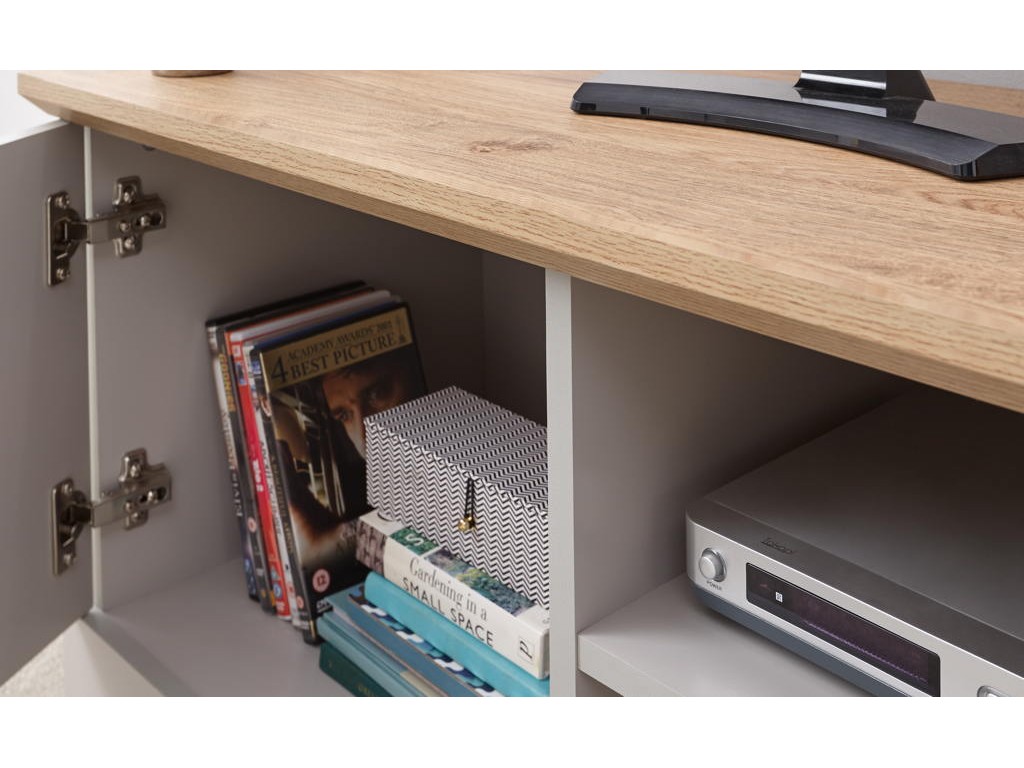 Even if you have only the most basic TV tech - TV screen plus viewing box or DVD player - you need somewhere to put it. If you're not a fan of glass-and-chrome showboating, you may well favour a more classically designed furnishing piece like this TV unit from the Kendal range. The unit's neat construction pairs a single door-fronted, groove-panelled cupboard with an open shelving section atop a deep base plinth - all in soft grey. The chunky oak-effect top adds rustic charm and provides a sturdy support for a TV screen.