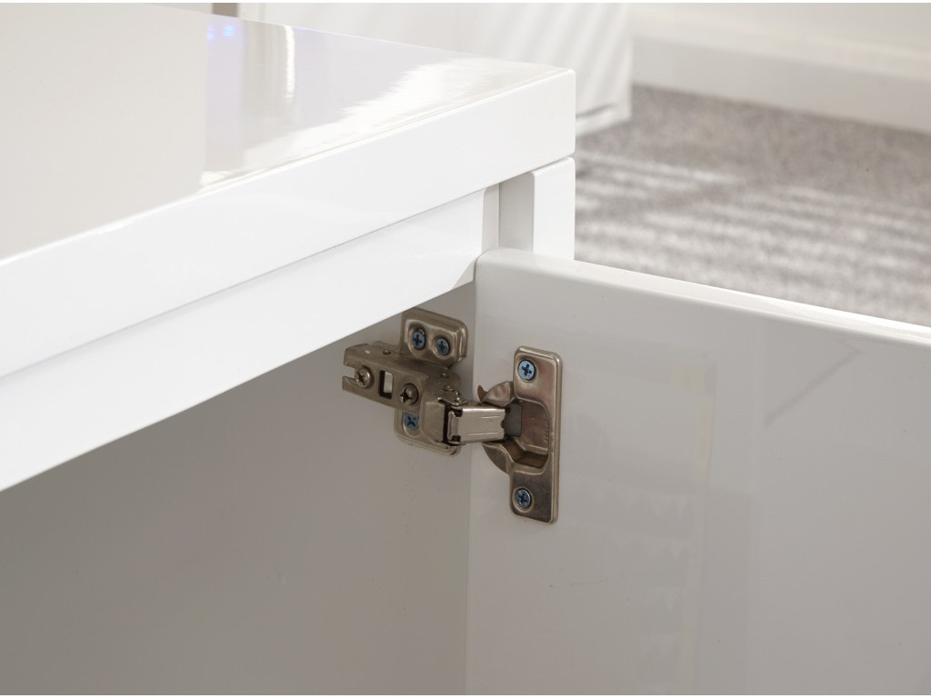 If you feel you deserve something special to house your TV tech, this luxury media station may well be your dream purchase. The chunky hollow-core construction gives the unit a solid look and feel, with clean, contemporary lines that are enhanced by the high-gloss brilliant white paint finish. The symmetrical design features a central open section with adjustable toughened glass shelf, flanked by a pair of cupboards enclosed behind bevel-top doors mounted on soft-close hinges. Supported on a slender plinth and illuminated by subtle battery-powered LED lights.